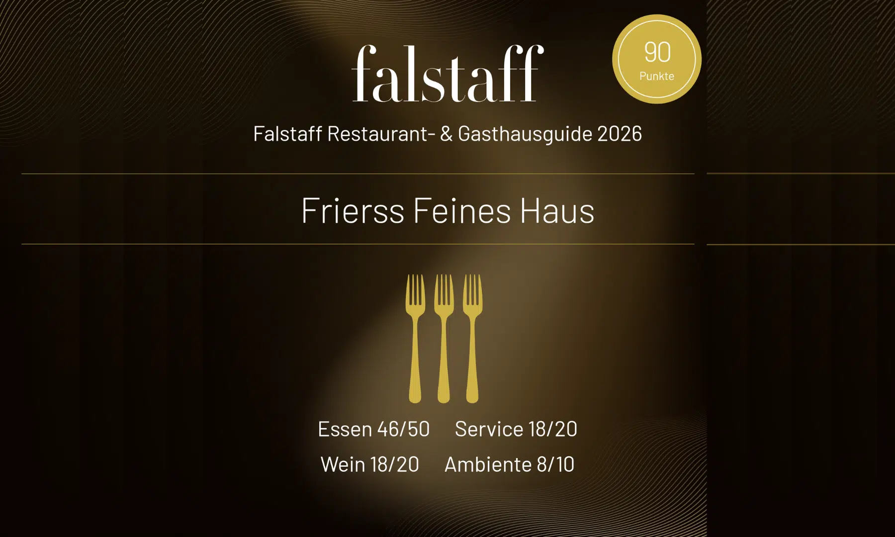 Seit der Eröffnung im Jahr 2013 zählt Frierss Feines Haus zu den besten kulinarischen Adressen des Landes. Mit Küchenchef Gregor Wohlmuth wird unser Restaurant um eine kulinarische Facette erweitert. Genießer dürfen sich auf eine internationale, urbane Küche freuen, die von österreichischen Klassikern, über zarte Steaks vom Holzkohlegrill bis zu asiatisch inspirierten Gerichten reicht. Mit größter Leidenschaft zu Altbewährtem und Mut zu Neuem, überrascht das junge Küchenteam mit Geschmackserlebnissen der besonderen Art.