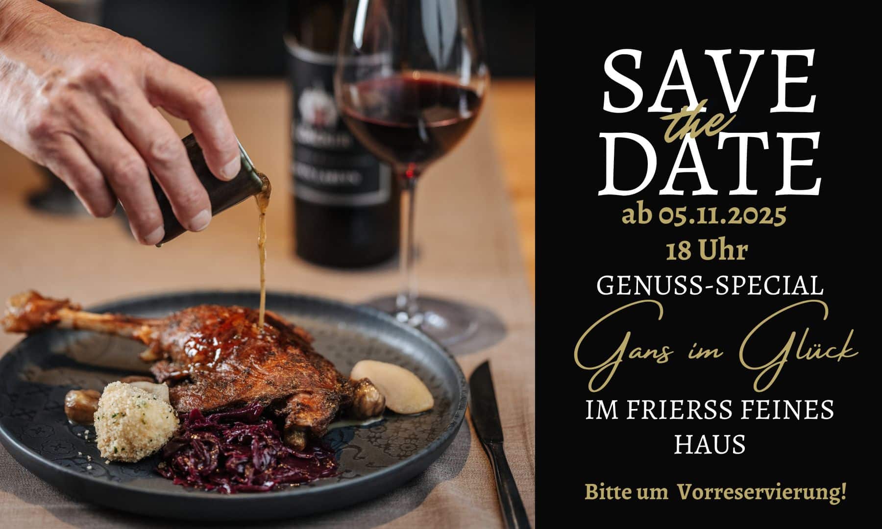 Wer Gansl mag, darf sich auf die wunderbare Gansl-Woche in Frierss Feines Haus freuen, wenn das Küchenteam rund um Küchenchef Gregor Wohlmuth mit raffinierten Gansl-Kombis begeistern.