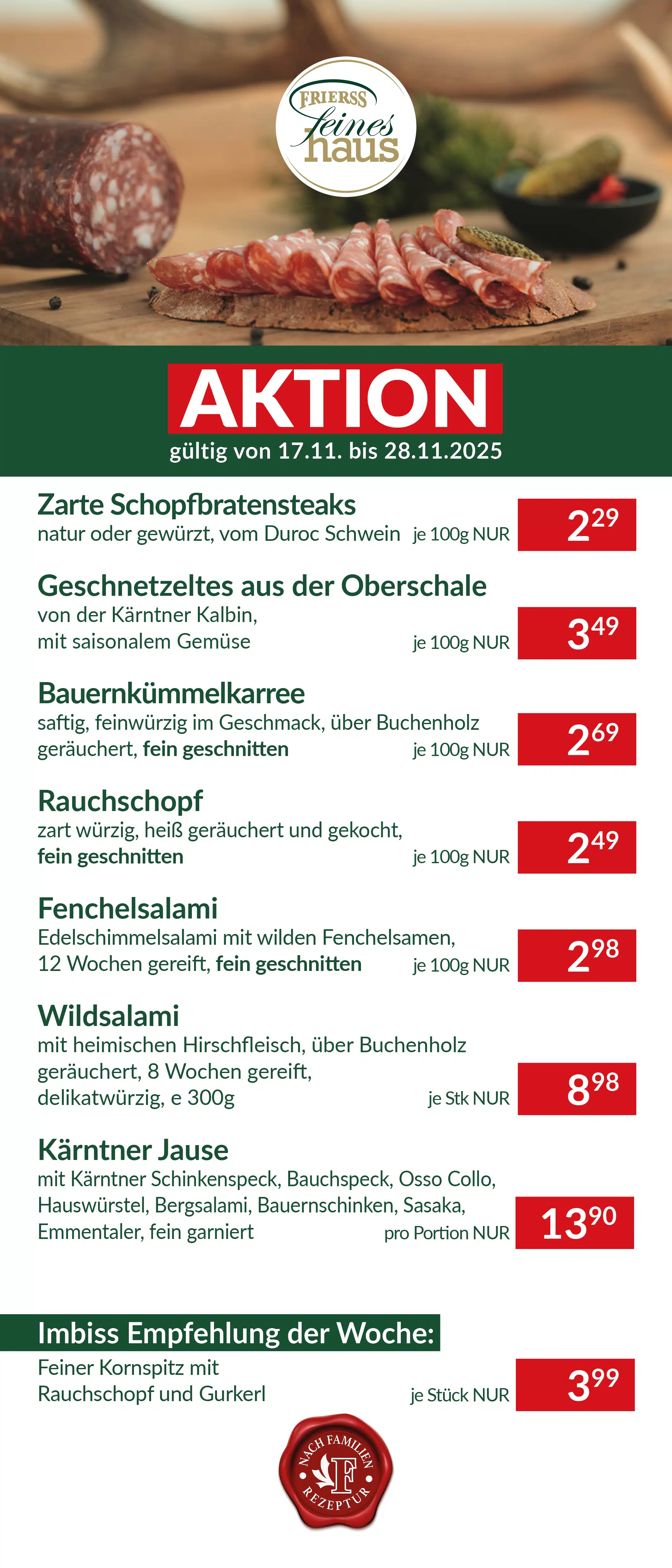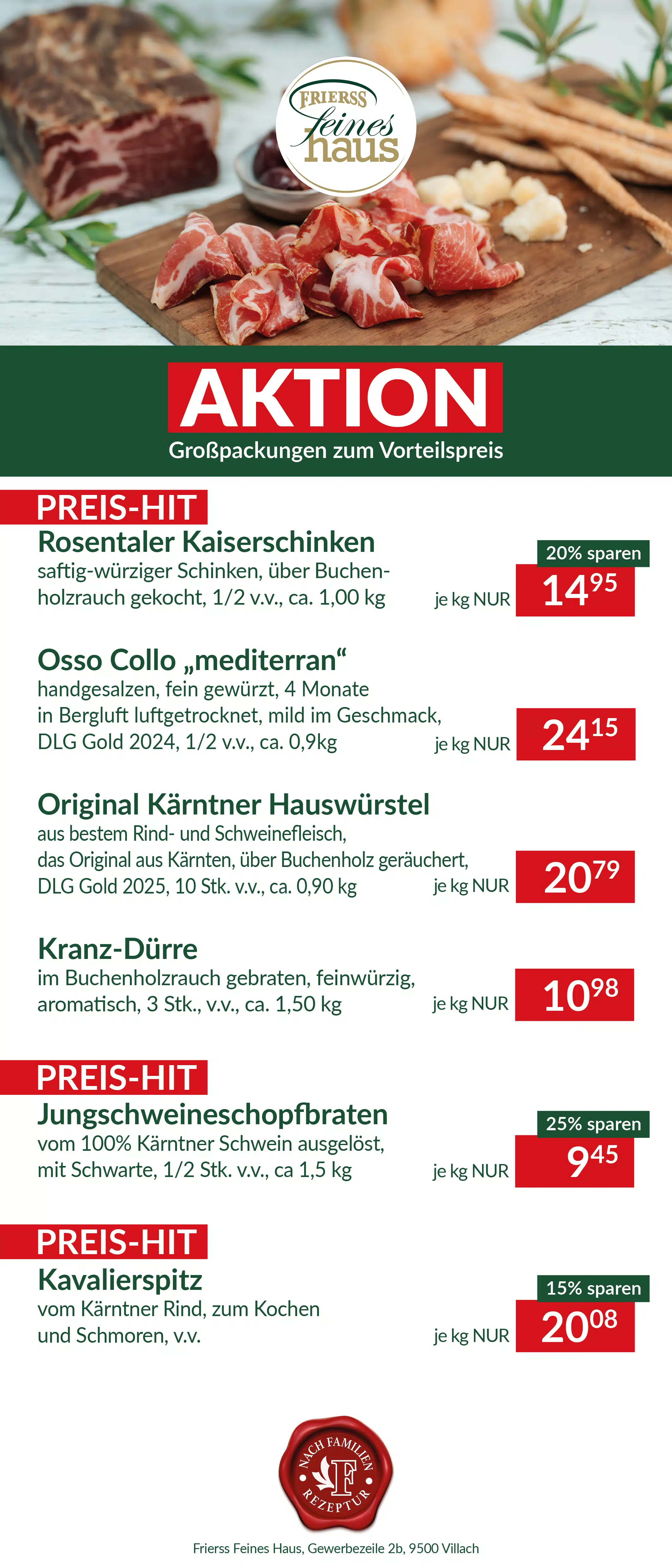 Warum? Weil wir bei Frierss unsere italienischen Spezialitäten seit Jahrzehnten mit 100% heimischen Fleisch handwerklich fertigen. So reift unser Prosciutto Castello in reinem Meersalz mindestens 14 Wochen in unserer Rohschinkenmanufaktur am Ossiachersee. Auch unsere Mortadella wird bei uns seit mehr als 75 Jahren aus heimischem Fleisch verfeinert mit einer speziellen Gewürzmischung und traditionell gebraten – besonders langsam, bis sich das herrliche Brataroma voll entfaltet. Dazu feinwürziger Osso Collo, unsere feine Crespone, die Königin der Salami, die bei uns 14 Wochen in Edelschimmel reift, feiner Rosmarinschinken, Dolce Latte und Antipasti. Ein Fest für den Gaumen!